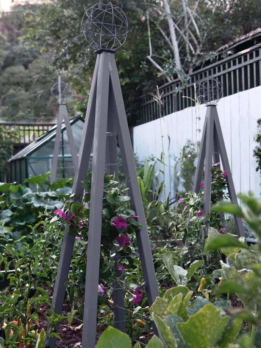 Create an instantly stylish garden with this contemporary obelisk topped with a sculptural stainless steel sphere by Terra Trellis. Use to train plants that climb or need support, or place in the garden for simple architectural punch. During the off-season, this tuteur becomes a striking work of art. Designed and hand-crafted in the U.S. from steel and stainless steel cable, finished in brilliant water-resistant powder-coated colors or a natural oxide patina. A sturdy structure for edible or ornamental gardens, great on the ground or on patios with containers. Very impactful in multiples.
