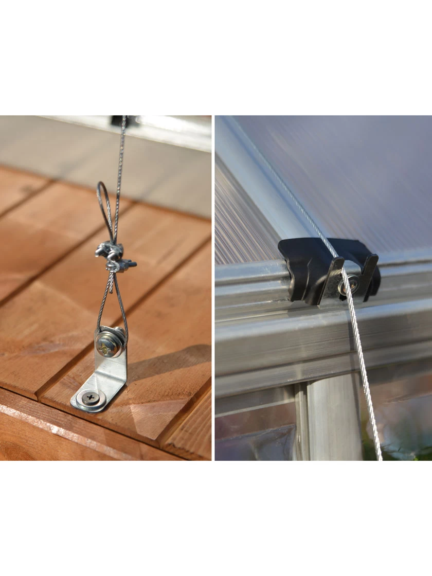 This Anchoring Kit adds extra protection against strong wind gusts, up to 62 mph. It is cleverly designed to fit your existing Palram –Canopia Greenhouse such as the Harmony, Nature, Mythos, Hybrid, Balance or Octave, and can be secured to the foundation of your choosing. This rugged and easy-to-use system gives you a series of steel cables with the necessary anchors and fasteners to keep your greenhouse snug and safe, right where you need it. If you live in an area with high winds or generally unstable weather, this simple system is a must-have. The cables simply go over the greenhouse, secured to the structure with a series of clamps, then secured to the ground with large stakes.