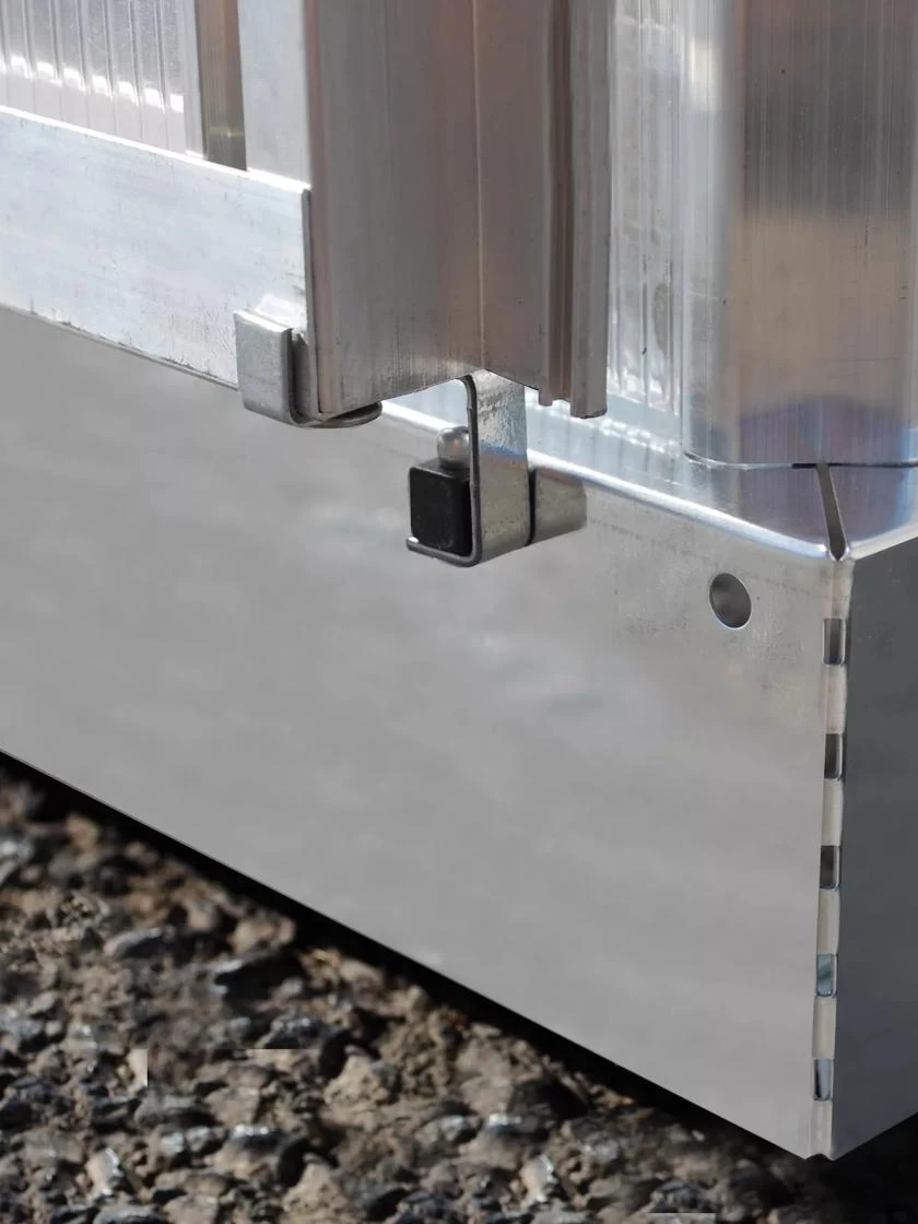 - Steel base, aluminum frame, double wall polycarbonate panels on roof, clear polycarbonate walls on sides