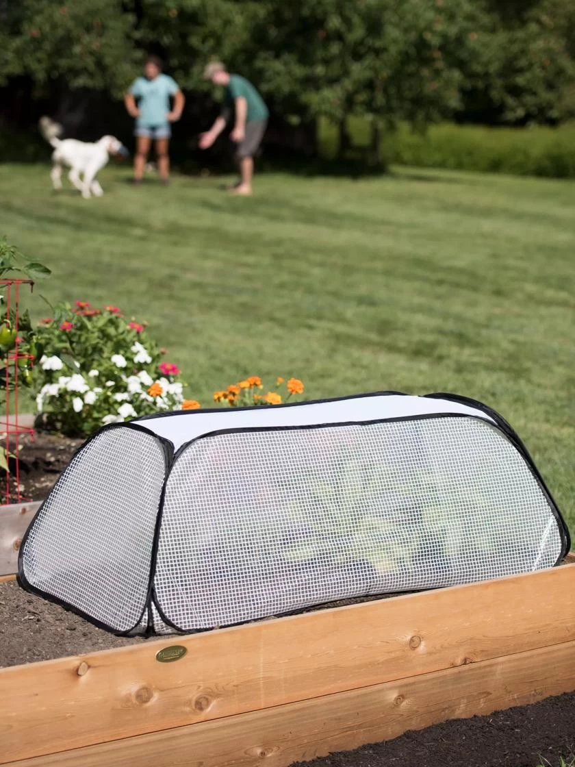 Garden row covers protect transplants from cold temperatures and chilly winds, so you can set plants out in the garden weeks earlier in spring. You’ll be amazed at how much faster plants grow — which means an earlier harvest! The top is made from mesh to allow warm air to escape, preventing overheating, and it also lets water in. Made from durable, reinforced greenhouse fabric. Sets up in seconds; flattens for easy off-season storage. Loops at the base let you anchor it to the ground with Earth Staples, sold separately.